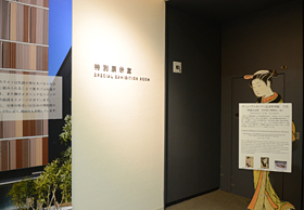 現在はクローズしている2階特別展示室の前でリニューアルオープン記念展のご案内をしているのは、当館のマスコット「おせんちゃん」。