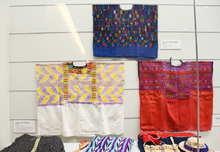 現在のテーマは「ウィピル」。この言葉、聞き慣れないと思います。ウィピルとは古代文明が栄えたメソアメリカで、メキシコ中央部から中米にかけての地域の先住民女性が着用している貫頭衣のことです。当館では、1990年代にグァテマラで行った調査の際に資料としてウィピルを収集しました。約20点所蔵しており、過去に数回展示しておりますが、今回は久しぶりのお目見えとなります。